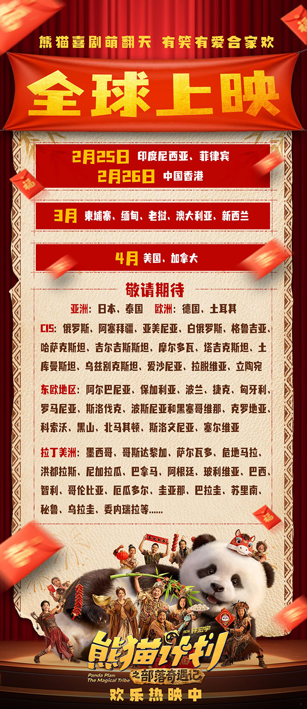 电影《熊猫计划之部落奇遇记》已于2月17日同步登陆新加坡、马来西亚、文莱及中国澳门地区,并在中国香港开启优先场放映,随后将于2月25日在印度尼西亚、菲律宾上映,2月26日全面登陆中国香港。