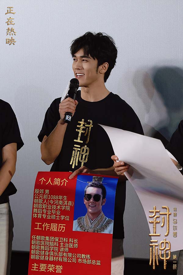 主创们与现场观众的互动更是丰富多彩。伴随着现场蒙古民族风的激昂乐声,马头琴响,百力嘎传授传统蒙古舞动作,各位年轻演员纷纷献上即兴单人舞蹈助兴,于适被赞不愧是叫做“周舞王”的男人。陈牧驰“大胆”模仿殷寿登基名场面,费翔幽默地用“商务殷语”回应:“你小子fun的可是straight!”随后有观众为众演员送上饭制角色简历,陈牧驰获赠“朝歌职业技术学院,舞蹈学院专业优秀毕业生”称号,此沙笑领“昆仑集团有限公司安保组组长,昆仑儿童工作处主任”头衔。此外,两位蒙古族演员的亮相将现场氛围再次拉高。僧格仁钦是导演乌尔善的老搭档,此次在片中分别饰演了魔家四将中的魔礼青和殷商大将殷破败两个角色。其勒木格则饰演了《封神第一部》中只闻其声的碧霄娘娘,令人期待他们在《封神三部曲》后两部中的精彩演出。