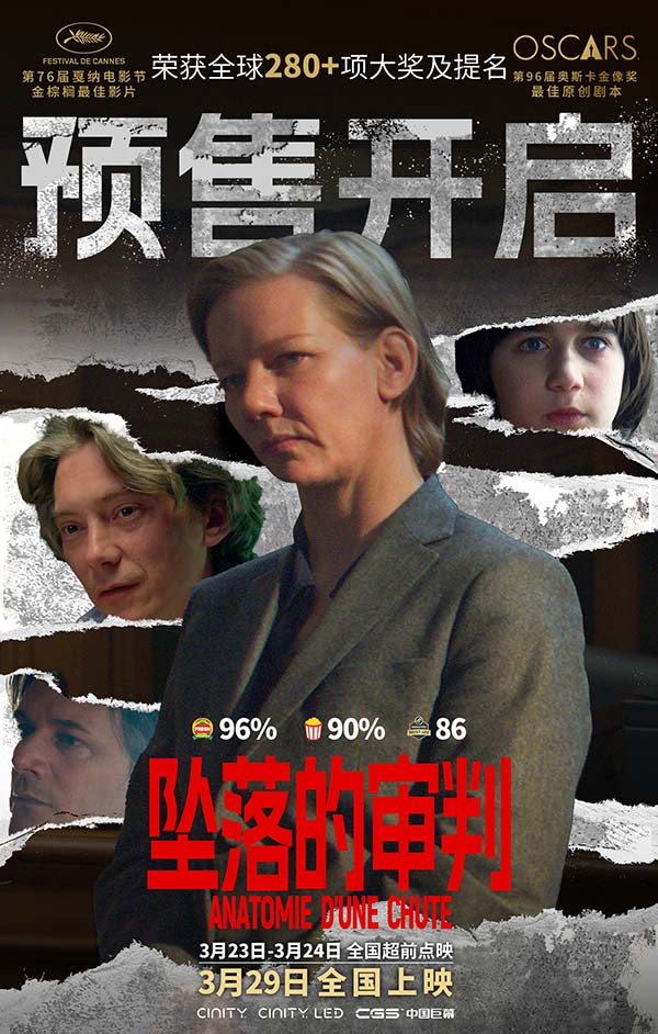 第76届戛纳金棕榈最佳影片、第96届奥斯卡最佳原创剧本得主《坠落的审判》今日释出终极预告,婚姻破裂夫妻针锋相对,法庭争辩真相扑朔迷离。截止目前,该片已实现奥斯卡奖、金球奖在内的280+项全球知名专业奖项及提名。凭借逼真细腻的手法深度解析了两性关系、女性主义与司法公正等话题,赢得了广大观众的喜爱。烂番茄新鲜度96%、爆米花指数90%,豆瓣评分8.5,无数影迷翘首以盼影片上映,希望能在国内大银幕看到此片。影片现已开启预售,3月23日-24日10城超前点映,3月29日全国公映均在火热预售中。导演茹斯汀· 特里耶也将首度来华,敬请期待!