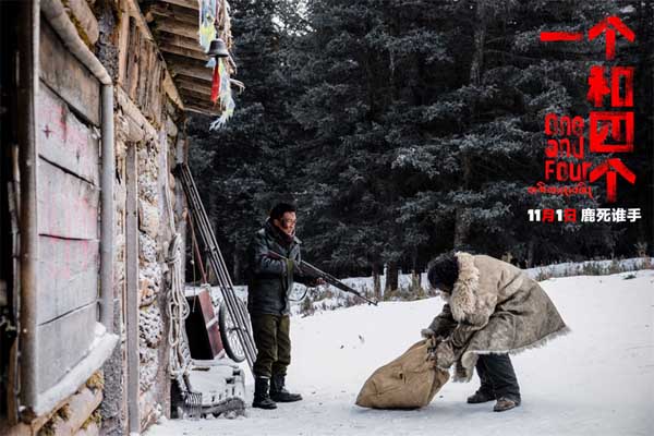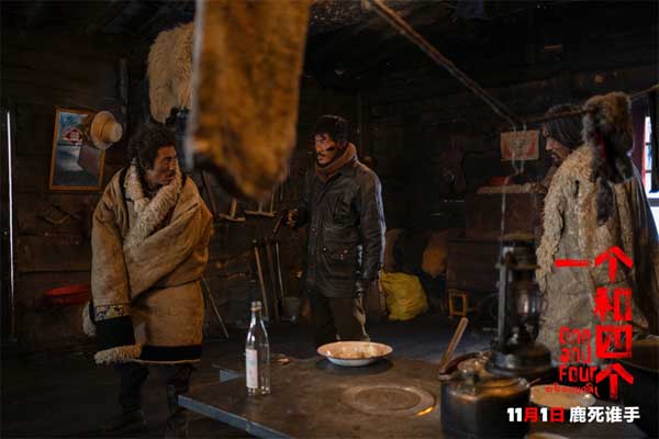 电影《一个和四个》以荒原雪林为背景,讲述了暴风雪来临之际,三名不速之客闯进了护林员的木屋,并由此牵涉出一件真相不明的盗猎案件。影片里一位自称是森林公安的陌生男子(王铮 饰)来到了护林员桑杰(金巴 饰)的小木屋中,在此埋伏并抓走了疑似盗猎接头人的同乡根宝(更旦 饰)。桑杰还未从震惊中缓过神来,另一位男子(达杰丁增 饰)持枪闯入,表示自己才是真正的公安。一时间,真相扑朔迷离,密林杀机四起......今日发布的定档预告中,冲击力极强的镜头语言下隐隐传递出暴戾与不安,风雪之中尔虞我诈,难忍猜忌之心的四人各怀鬼胎。险象环生之间,善恶难辨、洞见人心!