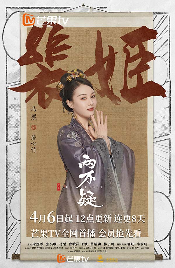 6日,由华策影视出品,何振华导演,宋妍霏、张昊唯、马栗、曹峻祥等主演的古装奇幻轻喜爱情剧《恩爱两不疑》于芒果TV、爱奇艺正式开播。该剧改编自绿野千鹤的同名漫画《两不疑》,讲述的是萧锦昀和徐钰因意外换身,相看两厌到恩爱不疑的故事,而马栗出演的女二裴心竹,是一个略有小聪明,爱慕萧锦昀且任性爱吃醋的姬妾,经常拉拢嫔妃姐妹门一起耍心机导致发生一系列恶作剧之事,但也因此成为萧锦昀和徐钰二人情感里重要的催化剂。
